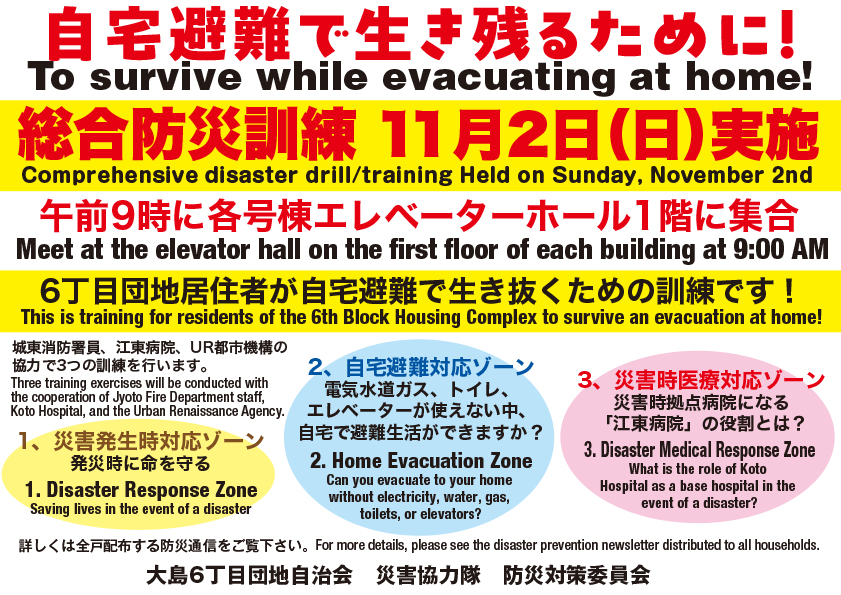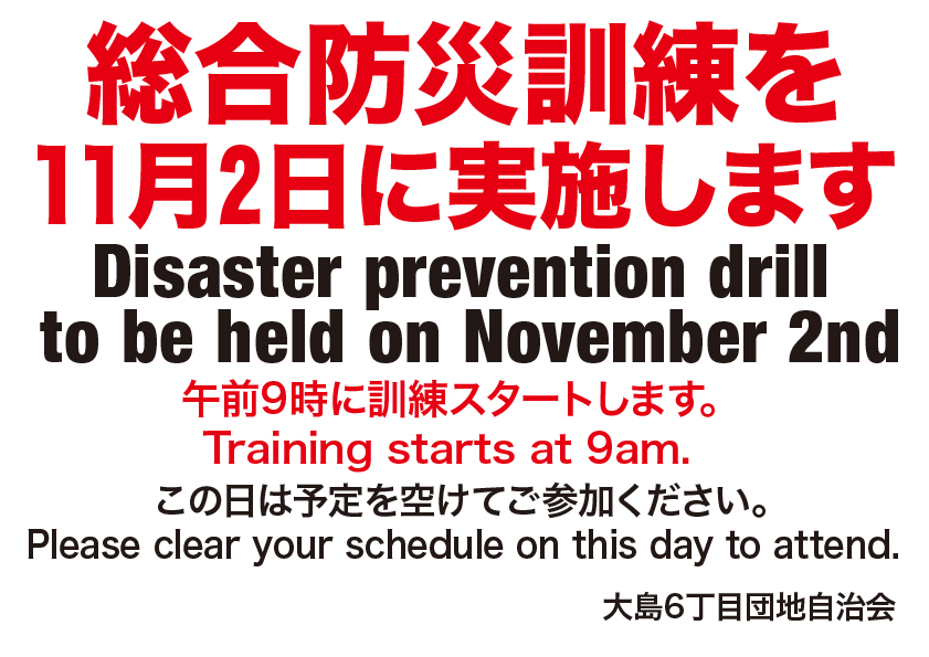 11月2日(日曜日) 午前9時、訓練開始します! 総合防災訓練に参加しよう! 詳しくは、全戸配布する防災通信をご覧下さい。 ●「PDF版ろくだん防災通信45号」 大島6丁目団地自治会 災害協力隊 戻る ホームページへ