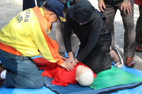 江東病院、城東消防署、災害時支援ボランティアの連携で行われた救急救護の共助訓練 心肺蘇生AED応急措置訓練 三角巾の応急措置訓練 江東病院の協力で災害拠点病院の役割と災害弱者の支援の説明 簡易担架の作成と移送訓練 ベランダ境界壁破壊体験 簡易トイレ組立、凝固剤使用体験 初期消火訓練 水害防災等研修(ビデオ放映) 外国人居住者への防災研修